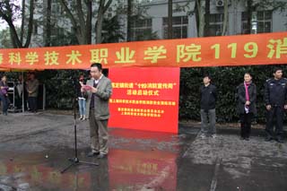 高校派出所长蒋建平,副所长孙喜明,嘉城派出所副所长戴洪斌,防火监督处史健丽科长,嘉定镇街道消防安全委员会办公室主任沈恩奎对此次消防演习进行了观摩、指导。活动前,沈恩奎作了“119消防宣传周”活动动员。樊珠主任在启动仪式上指出:嘉定镇街道对学院的消防工作高度重视,消防演习是学院深入宣传安全发展和贯彻“安全第一、预防为主、综合治理”方针,是建设“平安校园”的一项重要活动内容。