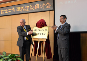 研讨会开幕式。上海高教学会高职高专创业教育专业委员会主任、上海科学技术职业学院董事长朱建新主持开幕式。市教委高教处许涛副处长、英国剑桥大学佳奇商学院创业教育专家艾伦.白睿(Alan Barrell)教授共同为“上海科学技术职业学院创业学习中心”揭牌。