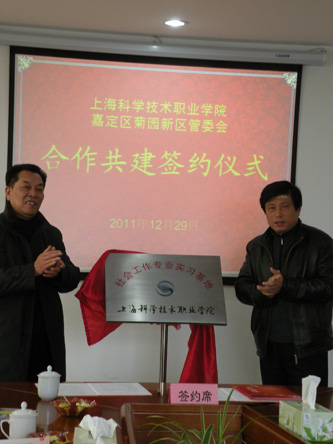 2011年12月29日上午,学院与菊园新区管委会合作共建签约仪式在菊园新区生活服务中心举行。学院党委书记、院长庄顺根,人文系主任万正方教授,副主任彭典贵及社工专业教师,菊园新区管委会领导,上海复原社工师事务所相关人员出席签约仪式,菊园新区人大联络室主任倪建平主持仪式。
