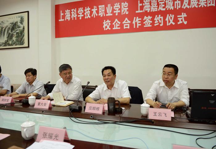 仪式上,庄顺根书记发表了热情洋溢的讲话。他首先代表学院向嘉定城市发展集团有限公司及下属公司对学院人才培养工作所给予的大力支持和帮助,表示由衷的感谢。他还特别感谢了自来水公司的领导,他说公司与学院有着密切的合作关系,是学院长期稳定的校外实训基地和就业单位,公司领导对我院毕业生的充分肯定是对学院最好的褒奖。他高度评价了此次的校企合作,他说,以张书记为首的集团高层领导能够亲临签约仪式现场,令学院深受感动,也为后续合作开展奠定了较高的起点。双方的合作意义非凡,既体现了企业的社会责任,也是学院发展的内在要求,体现了职业教育服务区域产业发展的重要功能。庄书记表示,校企合作办学是高等职业教育的基本属性,也是高职教育发展的必由之路,学院重视校企合作机制建设,致力于推动校企合作的双赢和长效发展。他希望,双方能够发挥优势,在专业建设、人才培养、实习就业等方面展开深层次合作,务实互信、共同努力,不断完善合作机制,创新合作形式,丰富合作内涵,扩大合作成效,实现互利共赢。