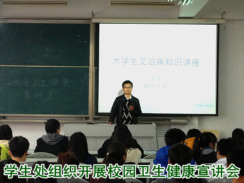 2014年3月20日中午,学生处于新教201组织开展题为预防艾滋病科普知识的校园卫生健康宣讲会。2012级、2013级生活委员近80名学生出席,嘉定区疾病预防控制中心张永医生进行此次宣讲。