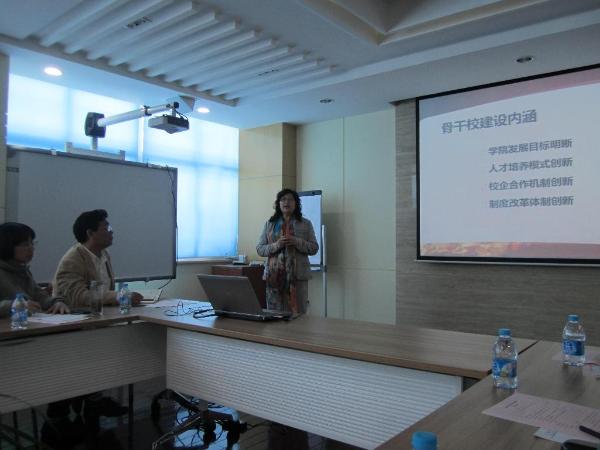 在简短的相互介绍后,举行了“国家示范性骨干院校建设经验”交流座谈会,杨秀英院长主持会议,该院主要职能部门负责人、系(部)主任参加了座谈会。座谈会围绕该院骨干校建设的做法和经验这一主题展开,共分三部分内容。第一部分,由杨秀英院长介绍骨干校建设的顶层设计理念、举措和成效。首先,她与大家一起回顾了骨干校建设的背景——学院刚刚迁入新校区时所面临的内部困难和外部挑战,以及学院领导班子和教职员工如何在逆境中思变和寻求突破。随后,她介绍了该院如何以重点建设工作为抓手、以凝神聚力为保证,从明晰学院发展目标、创新人才培养模式、创新校企合作机制、创新制度改革体制四个层面全面推进内涵建设。继而,介绍该院如何以骨干校建设为核心、以改革创新为动力,推动事业全面发展。她总结了该院骨干校建设的难点和创新之处,即硬件建设的系统性、软件建设的合理性和管理运作的适应性。最后,她与考察团一起分享了全体教师员工如何以红烛精神为源泉、以求真务实为追求,赋予校园文化新的时代特征,并枚举了两年建设的主要收获与成效。每一个电子信息学院员工在创建骨干校过程中所表现出来的攻坚克难、锐意进取、勇于创新的精神,使考察学习团的成员深为敬佩,也赢得了现场的阵阵掌声。