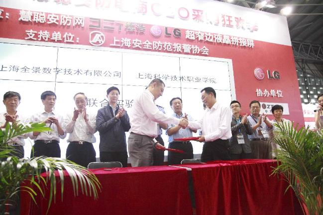 上海全景数字技术有限公司与上海科学技术职业学院于6月4日在第十四届上海安博会现场隆重举办了双方成立联合实验室的签约仪式。上海报警协会理事长孙廷华、上海内保处处长陶焱升、上海全景数字技术有限公司(以下简称全景数字)董事长林立及总经理胡力旗、上海科学技术职业学院董事长朱建新及院长庄顺根等领导及慧聪网、中国公共安全、安全自动化、安防市场报、安防展览网等媒体代表出席了签约仪式。