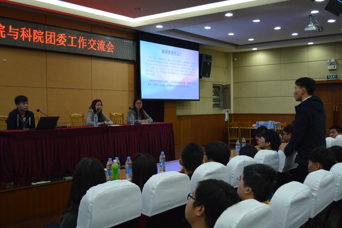 同一时间,五号报告厅也十分热闹,三校团干部交流会在此举行。三校优秀团干部齐聚一堂,带着各自对团委不同的见解娓娓而谈。科院团委代表发言表示,团委学生会应是一座联系老师和同学的桥梁,要与各班团干部同心协力,携手共进。 之后,我校团委学生会各部门部长就本学期各部门的工作做了简要介绍,并对以往的工作进行总结。 最后,参会的三校团干部进行自由交流学习,分享自己的心得体会。在场的每一个人都希望,通过这次交流会,能促进学院间的友谊发展,通过互相借鉴学习,将各校共青团的建设工作越做越好。