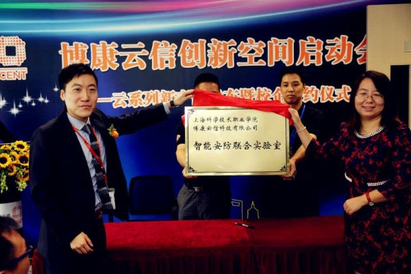 2016年10月18日,学院副院长韩芳、通信与电子信息系主任陈泉林等老师前往中山公园商业圈来福士广场,参加博康云信科技有限公司乔迁新址暨新品发布会,同时与该企业进行了“智能安防联合实验室”校企合作的签约及揭牌仪式。