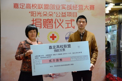 开幕式结束后,嘉定高校联盟携手小时代广场对由嘉定区红十字会和嘉定区广播电视台联合发起的“阳光朵朵”公益项目进行捐赠,嘉定区红十字会副会长朱培令接受所捐善款。