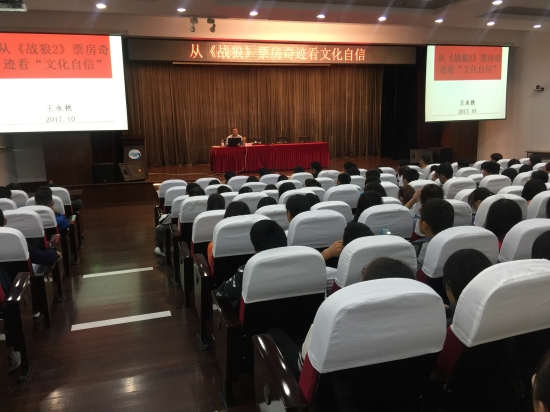 10月12日晚,校学生处邀请同济大学王永秋教授来校作题为“从《战狼2》票房奇迹看文化自信”专题讲座。全校各院系近500名师生参加,学生处处长吴育红、人文与社会科学系书记沈斌出席讲座。讲座由学生处阎婧老师主持。