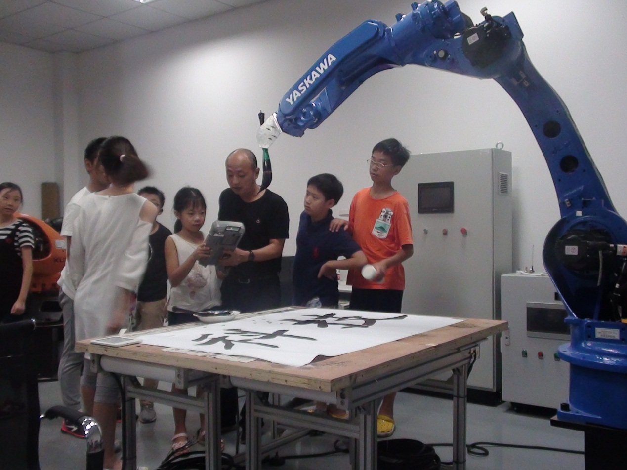 第三天,以工业机器人写字和现代工艺自动化流水线操作为主。操控工业机器人书写“科技”两字的编程是由我院师生自己编写的,虽然机器人的笔划一板一眼,但所写字体却是那么栩栩如生,体验者惊叹机器人手臂的灵活性,亲自上手操控机器人手臂书写。志愿者还向体验者讲解并演示了使用PLC控制现代工艺自动化流水线,在一台长2米,宽70公分的机器上呈现物品从原料加工到出仓的全过程。通过三天的体验活动,体验者对智能工业机器人的原理以及在日常生活中的运用等有了较为系统的了解,指导老师特地出题考了大家,前三名体验者更获得了3D模型礼品。