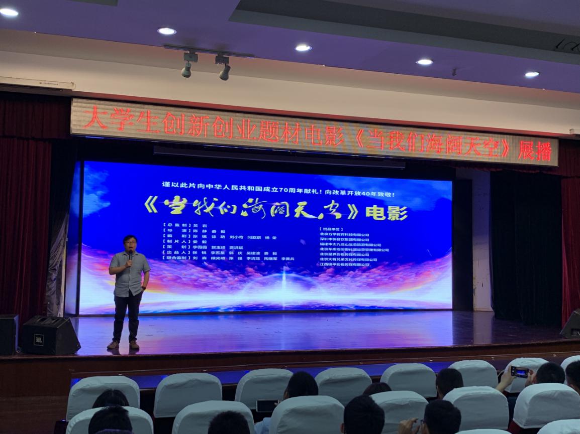 电影《当我们海阔天空》旨在落实习总书记给中国“互联网+”大学生创新创业大赛“青年红色筑梦之旅”的重要回信精神,落实教育部陈宝生部长在全国教育大会上“我们要拍属于自己的教育电影”的指示,由教育部高等教育司全程指导,吴岩司长总监制,北京电影学院党委书记和副院长联合监制的向新中国成立70周年的献礼片。影片展现了新时代高等教育改革和创新创业教育浪潮中,一群敢闯会创的大学生在老师们帮助下,运用知识与科技,整合多种社会核心资源,打通繁华都市与贫困山区的产业价值链,不仅成就自己梦想,而且帮助数以万计的农户脱贫致富的热血奋斗故事!电影将于6月6日全国院线公映,此次我院组织专场观影,是电影公映之前的点映活动。