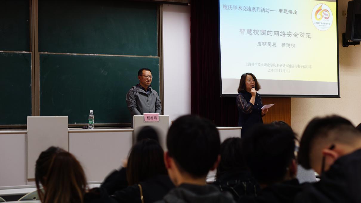 应上海科学技术职业学院科研处、通信与电子信息系联合邀请,启明星辰信息技术集团股份有限公司高级培训讲师杨德明于2019年11月1日为我院师生带来了“智慧校园的网络安全防护”专题学术讲座。出席此次讲座的有我院常务副院长韩芳,科研处处长徐华、通信与电子信息系主任赵东东、通信与电子信息系等近200名师生。讲座由常务副院长韩芳主持。