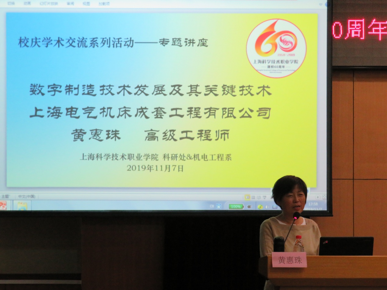 应上海科学技术职业学院科研处、机电工程系联合邀请,上海电气机床成套工程有限公司高级工程师黄惠珠于2019年11月7日来我院开展了主题为“数字制造技术发展及其关键技术”的专题学术讲座。出席此次讲座的有我院科研处处长徐华、机电工程系机电一体化专业主任吴信及机电工程系等200余名师生。讲座由科研处处长徐华主持。