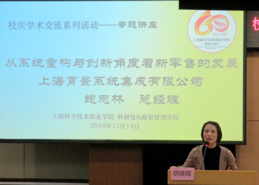 应上海科学技术职业学院科研处、商贸管理学院联合邀请,上海育景系统集成有限公司总经理鲍志林2019年11月14日来我院开展了主题为“从系统重构与创新角度看新零售的发展”的专题学术讲座。出席此次讲座的有商贸管理学院师生近200名听众。讲座由商贸管理学院院长胡晓晖主持。胡晓晖院长首先向大家介绍了鲍志林总经理,并对鲍经理百忙之中来我院进行学术交流表示了感谢。