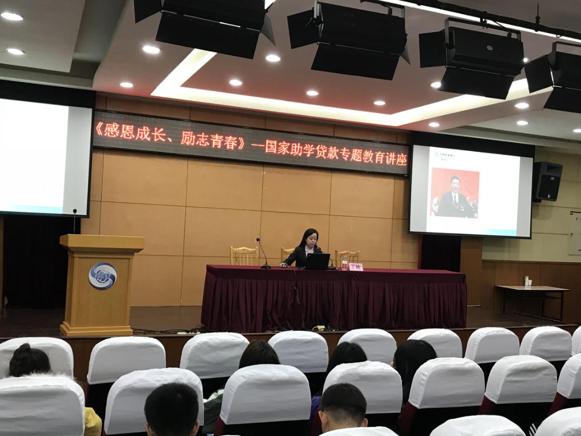 2019年11月26日中午,我院学生资助管理中心、学生工作处于新教五楼报告厅组织开展“感恩成长,励志青春”——国家助学贷款专题教育活动。此次活动邀请中国农业银行嘉定支行信贷部丁艳主讲,我院学生工作处处长沈斌、200余名国家助学贷款学生聆听讲座,学生资助管理中心许云峰主持。