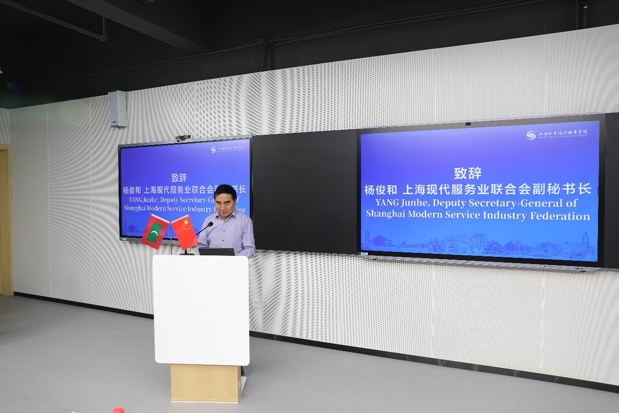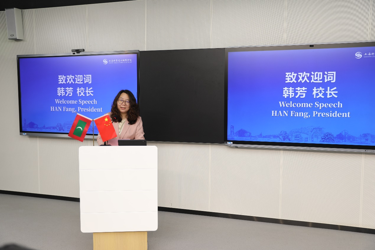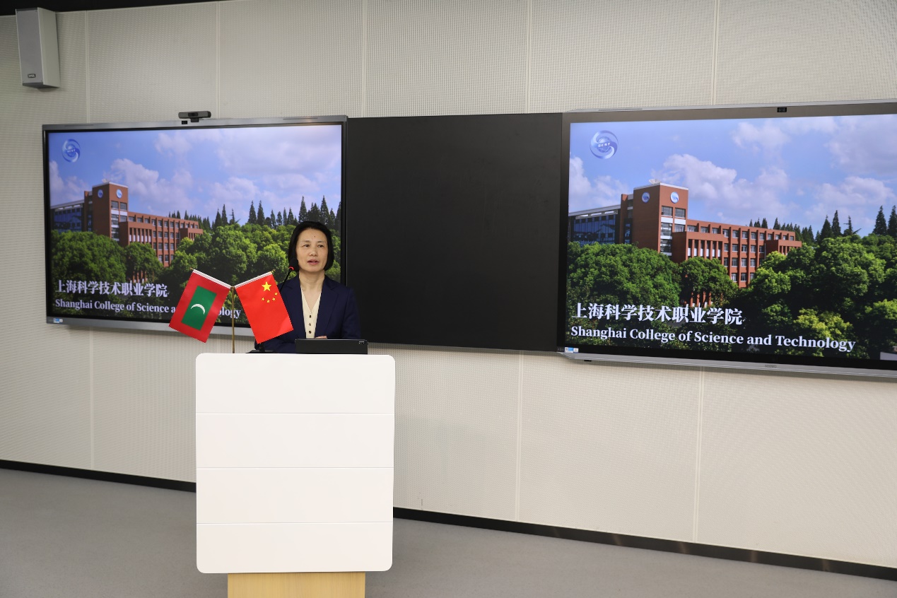 在开班仪式上,院长韩芳致欢迎词,她表示此次培训不仅是中马友谊的生动体现,更是两国在数字经济领域合作的重要里程碑。希望通过‘中文+职业技能’的模式,为马尔代夫青年提供更多发展机遇。上海现代服务业联合会副秘书长杨俊和强调,此次活动将为中马青年企业家搭建交流平台,促进双向赋能与可持续发展。副院长胡晓晖向访学团详细介绍了上海科学技术职业学院的办学历史、办学特色以及近年来国际交流与合作方面所取得的成果。