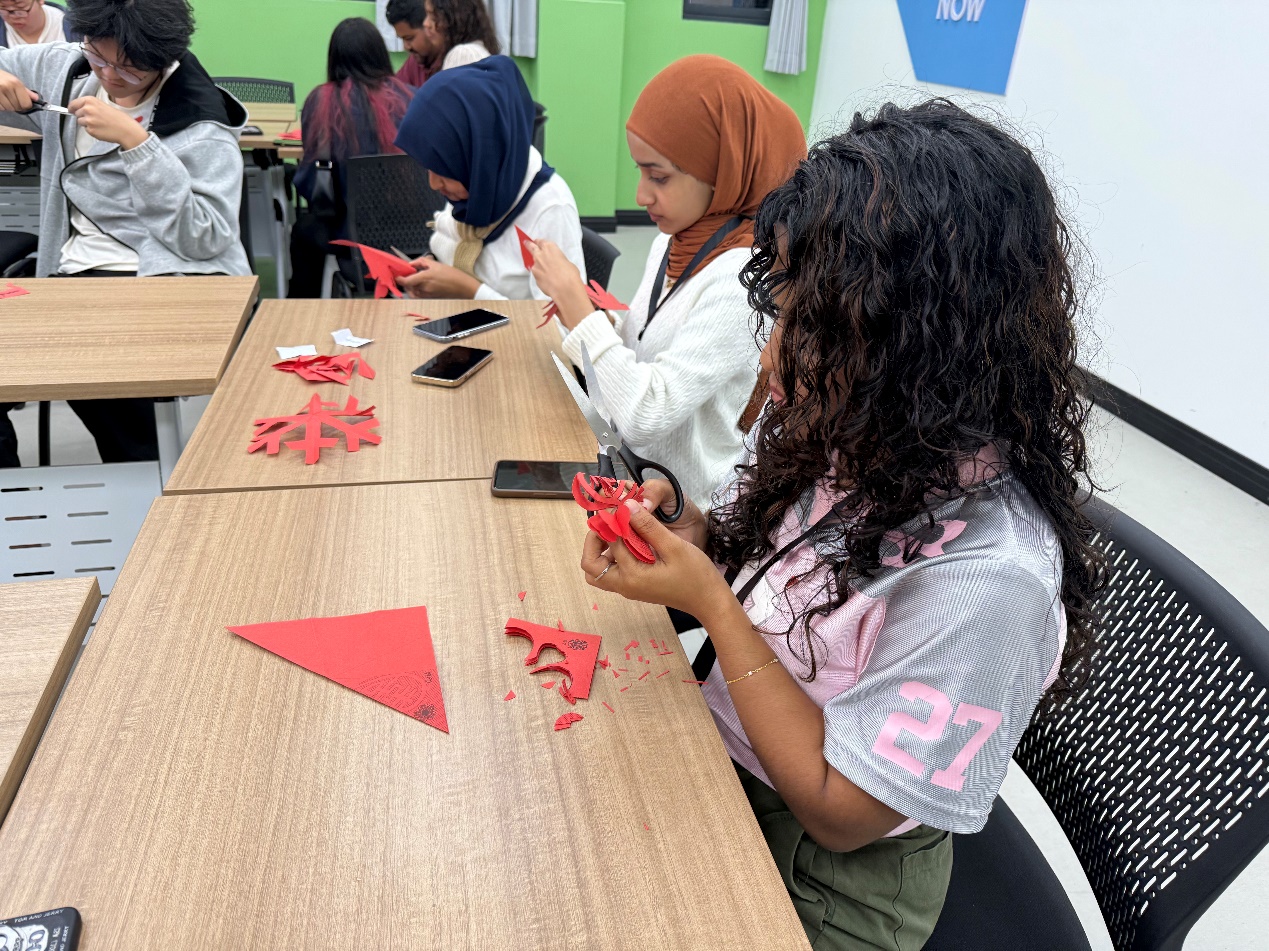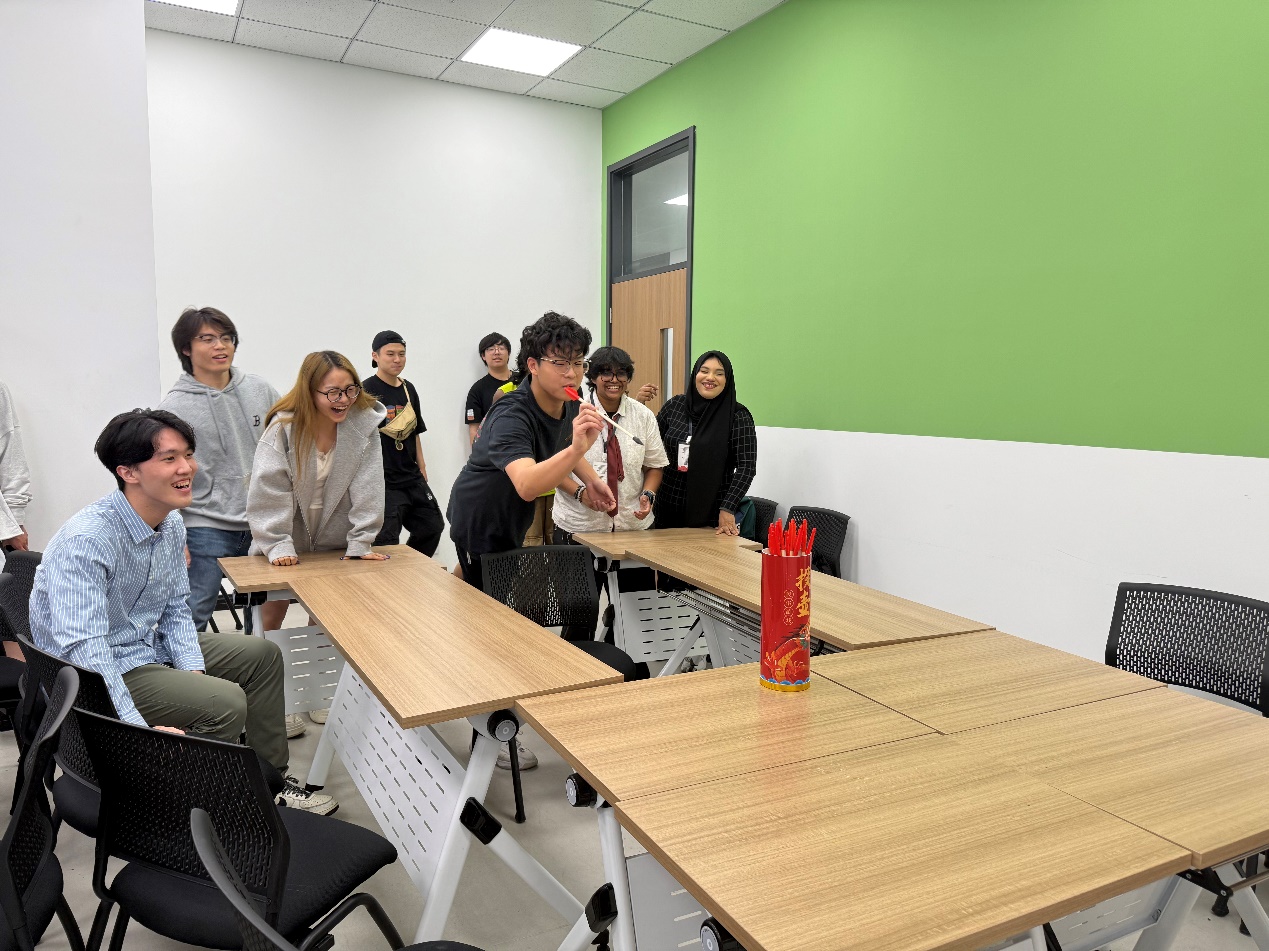 访学期间,学员们积极参与了“中文+中国文化”体验课程和“中国文化沙龙”活动。中马学生学习了基础中文发音和日常用语,通过互动游戏加深了对中国文化的理解。学生们共同参与投壶挑战、筷子夹物大赛和剪纸比拼等趣味游戏,一起观看中国电影《哪吒》,现场欢声笑语,气氛热烈。活动结束后,学生们互赠纪念品,进一步加深了友谊。